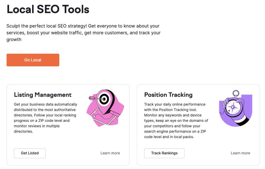 If you’ve been researching local SEO tools, Semrush is a name I’m sure you’ve come across once or twice. To help businesses go local, the solution provides four key features: